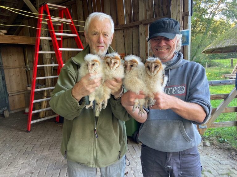 Op 22 mei van dit jaar bezochten mijn vrouw Mirjam en ik avonds weer vele erven in de Hof van Twente om vooral jonge steenuilen te gaan ringen als plotseling onder het rijden de telefoon ging. Een controleur van onze stichting belde en vroeg of wij per direct naar een erf konden komen om een aantal jonge kerkuilen van circa 6 weken oud te ringen. Haast was geboden omdat de jonge kerkuilen op punt van uitvliegen stonden.