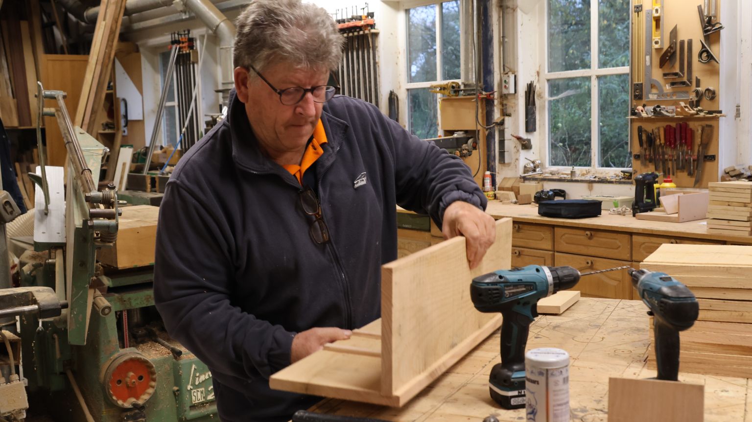 De koffie, thee en de overheerlijke vlaaien dragen bij aan deze fantastische introductie voor nieuwkomers Erik Cent, Stefan Koning en Jan Kamphuis. Dirk zaagt vlak naast het koffiezetapparaat; werken voor Stichting Hofvogels is een mooi feestje. Kwaliteit van werk staat hoog in het vaandel van de Kast’n Kearls, en de beloning in de werkplaats vandaag is navenant.