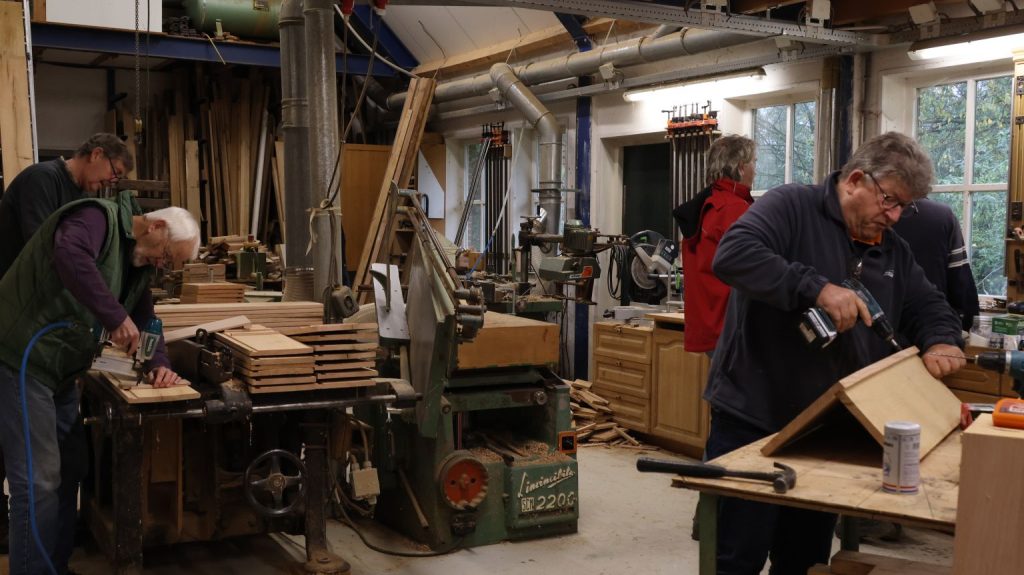 De 3 nieuwe vrijwilligers zijn op de juiste plaats vandaag. In Ambt-Delden worden nieuwe kasten in elkaar gezet, maar er worden ook reparaties uitgevoerd. Sommige kasten gaan 10 jaar mee, en dat zegt veel over de kwaliteit van de uitgevoerde werkzaamheden. De Kast’n Kearls doen veel meer dan timmeren: kasten ophangen, controleren en verplaatsen.