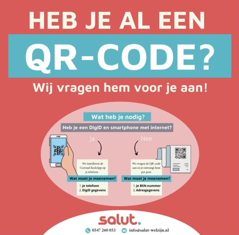 Heb jij al een QR code? Salut vraagt hem voor je aan! Kom vrijdag 22 oktober tussen 10:00 -12:00 uur of op donderdag 28 oktober tussen 15:00-17:00 uur naar Salut. Heb je een DigiD en smartphone met internet? Neem dan je telefoon en DigiD gegevens mee. Heb je geen smartphone? Neem dan je BSN-nummer en adresgegevens mee. Meer weten? Bel Salut 0547-260053, app 06-20894999 of mail [email protected]