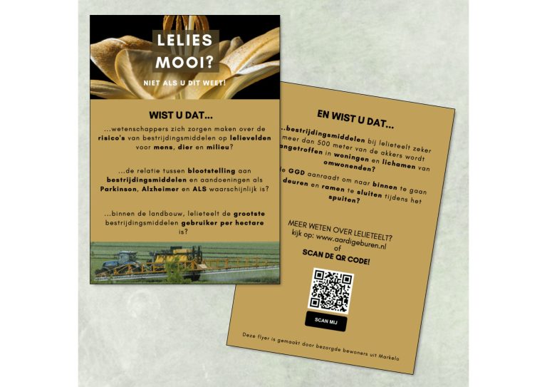 De teelt van lelies ontmoet steeds meer weerstand in onze gemeente. Deze week verspreidde een groep ‘bezorgde bewoners uit Markelo’ op ruim 9.000 adressen een flyer over de risico’s van deze bollenteelt. De flyer verwijst naar de site aardigeburen.nl met veel informatie over dit onderwerp.