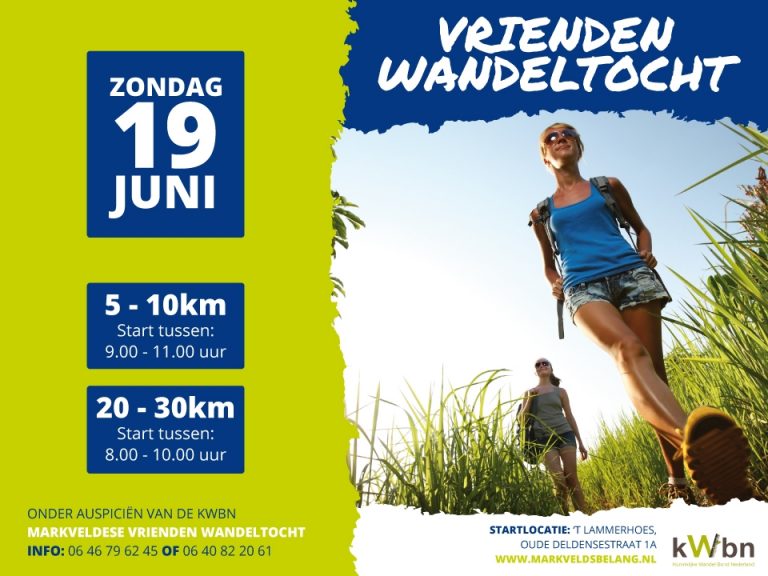 Op zondag 19 juni vindt de eerste Markveldse Vrienden Wandeltocht plaats. Vanaf startlocatie ’t Lammerhoes aan de Oude Deldensestraat 1a te Markvelde voeren diverse routes door de mooie landelijke omgeving op de grens van Twente en de Achterhoek. Er zijn diverse routes uitgezet van 5, 10, 20 en 30 km. De start van de beide langste afstanden is tussen 08.00 en 10.00 uur. Voor de 5 en 10 km kan gestart worden tussen 09.00 en 11.00 uur. Het inschrijfgeld bedraagt € 3,50 per persoon, kinderen tot 12 jaar kunnen gratis deelnemen en leden van de wandelbond betalen € 3,00.