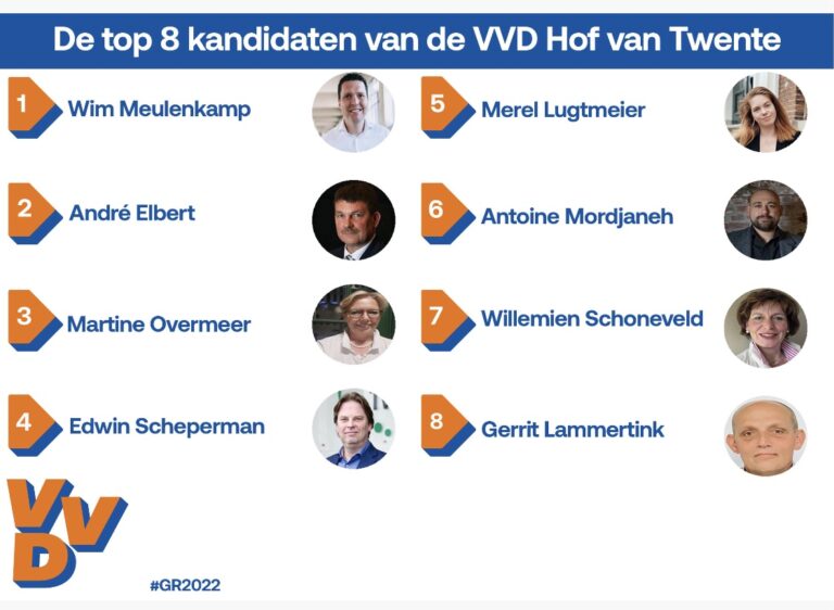 De VVD Hof van Twente heeft op 27 november de kieslijst vast gesteld voor de gemeenteraadsverkiezingen 2022. De liberale partij kiest voor diversiteit in haar lijst. Eerder werd al bekend dat wethouder Wim Meulenkamp opnieuw lijsttrekker is voor de partij.