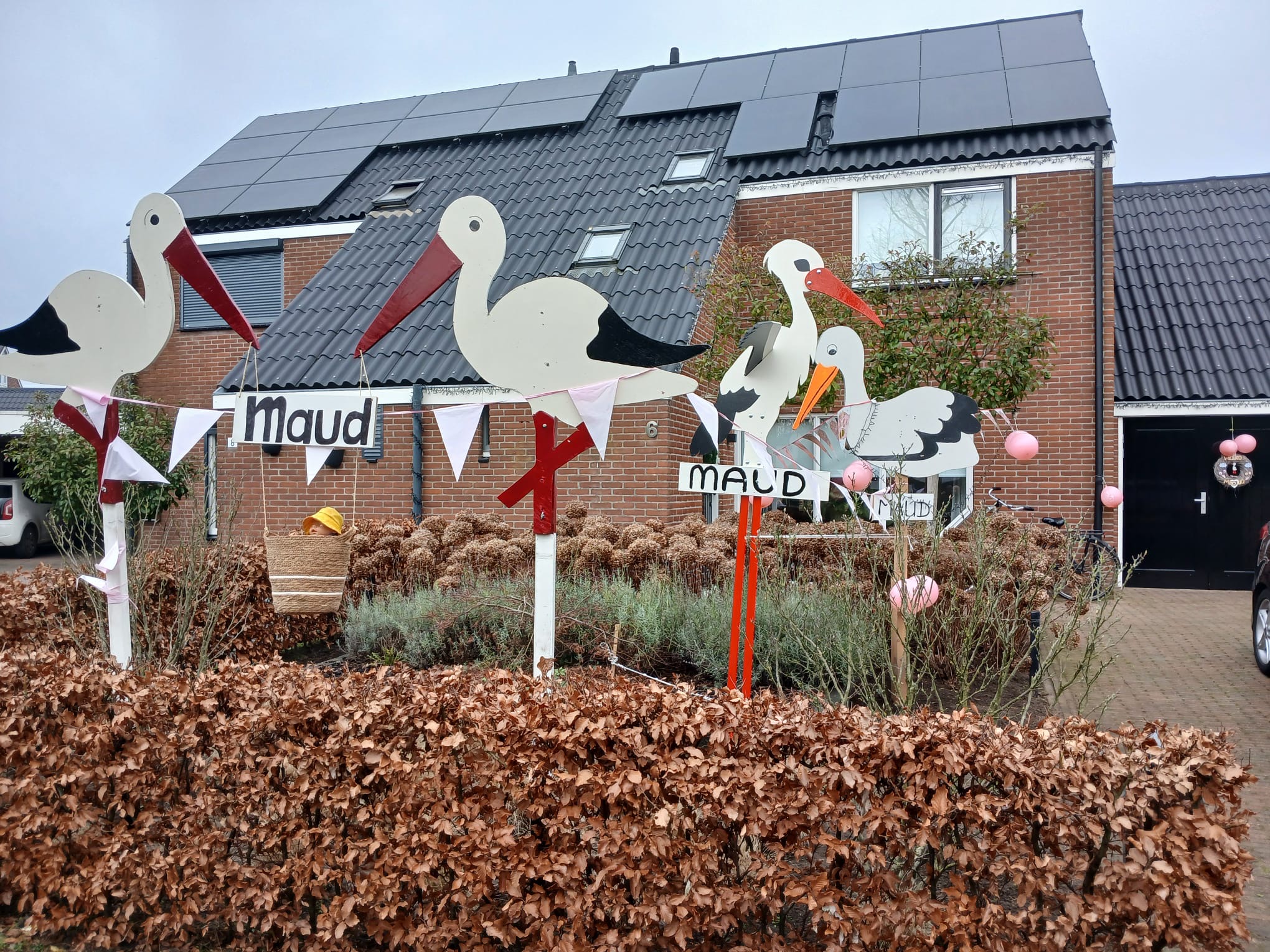 De tuin van Justin Alferink en Ellis Rupert aan de Hekkemansbeld is feestelijk versierd met ooievaars. Namens vrienden, buurt, familie en de redactie: van harte proficiat met de geboorte van dochter Maud! Grote zus Louise is dolblij met haar nieuwe zusje.