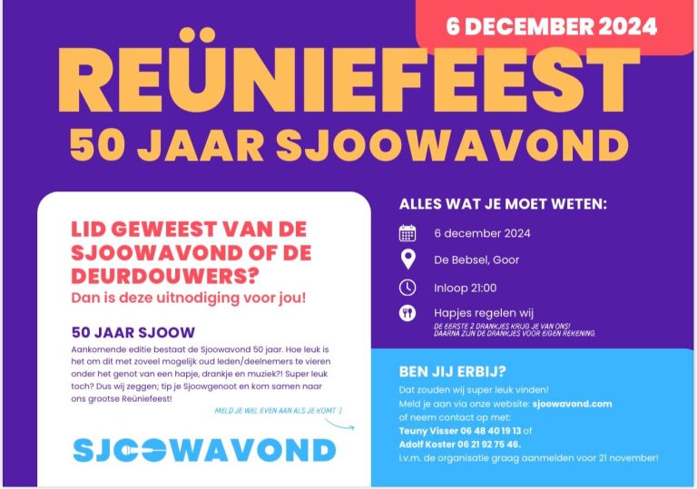 Een gouden jubileum voor de Sjoowavond dat het 50-jarig bestaan gaat vieren met een reünie voor alle deelnemers, oud-deelnemers en oud leden op 6 december aanstaande én een ‘Gouden Sjoow’ in maart van volgend jaar. De Sjoowavond komt voort uit de toenmalige Gala-avonden van carnavalsvereniging De Deurdouwers in Goor…