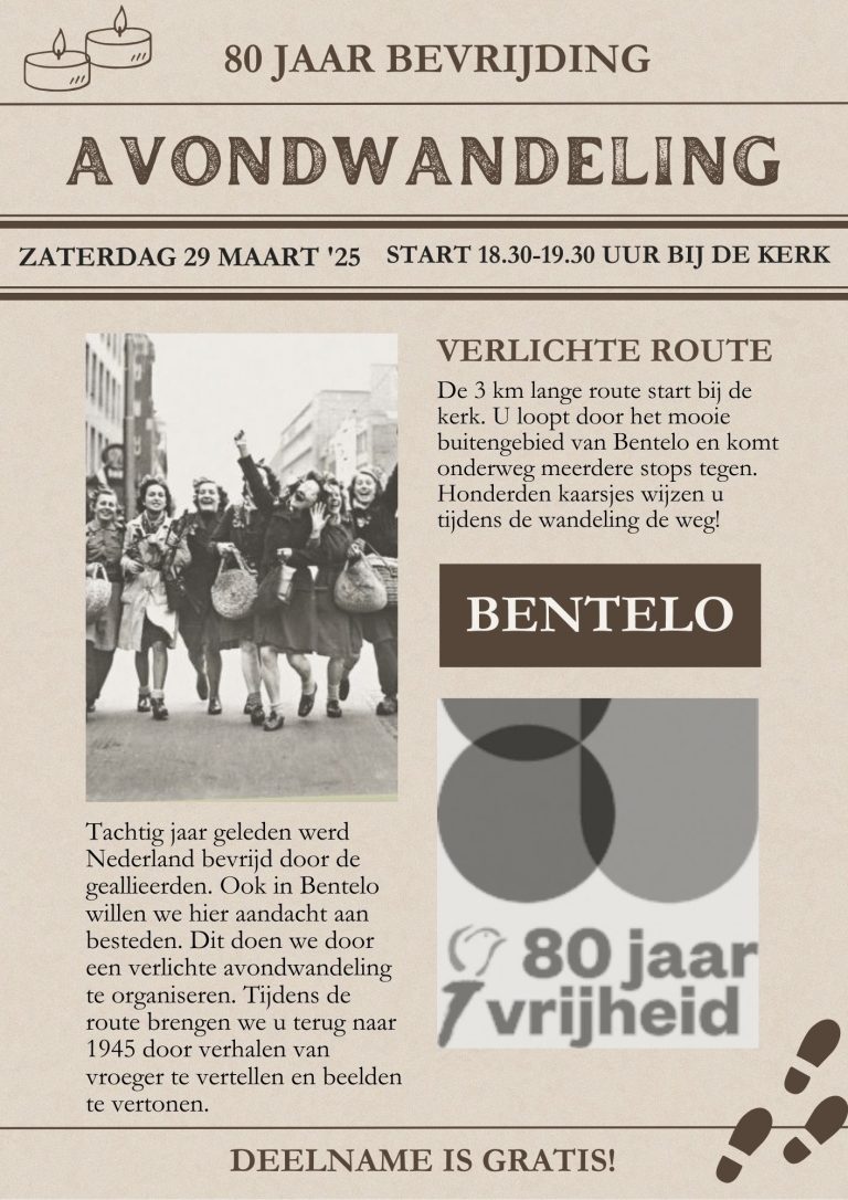 Tachtig jaar geleden werd Nederland bevrijd door de geallieerden. Ook in Bentelo willen we hier aandacht aan besteden. Dit doen we door een verlichte avondwandeling te organiseren. Tijdens de route brengen we u terug naar 1945 door verhalen van vroeger te vertellen en beelden te vertonen.