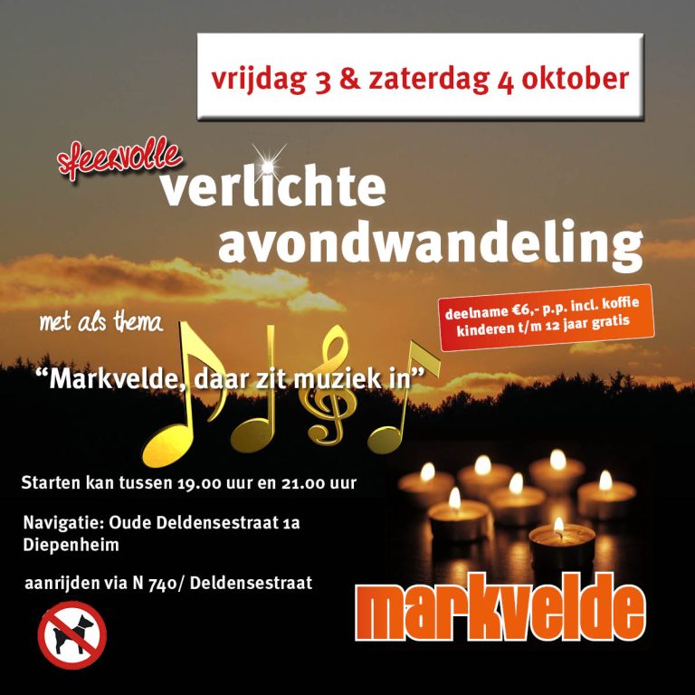 MARKVELDE- Dit jaar is onze welbekende verlichte avondwandeling in Markvelde is op vrijdag 3 en zaterdag 4 oktober. Het gaat om een tocht van 5 kilometer over wegen, paden en landerijen waar u normaal niet komt. We komen dit jaar niet op openbare wegen, we steken ze alleen over . U raakt verwonderd en verdwaald in onze/eigen omgeving!