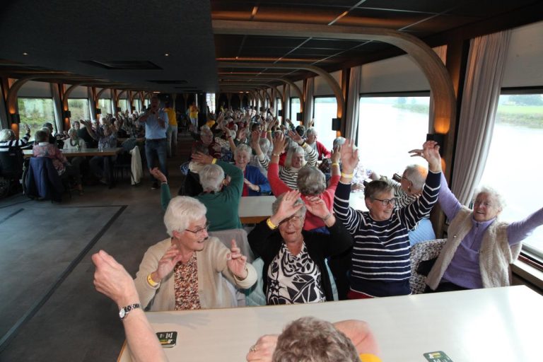 Eenmaal aan boord was het tijd voor een heerlijk kopje koffie/thee met kruidkoek. Terwijl het schip voortgleed op de IJssel was het rond 12:15 uur tijd voor een heerlijk diner aan boord van het schip. De 11 vrijwilligers van Franje hebben de gasten kunnen verwennen met een fantastisch en compleet diner; ook een hapje en een drankje in de middag ontbrak niet. Het werd echt gezellig want er was ook nog eens livemuziek aan boord! Paul Gelen en Herjan Holterman hebben gedurende de middag optredens verzorgd die aansloegen. En hoe! De polonaise was bijna even lang als het schip….!