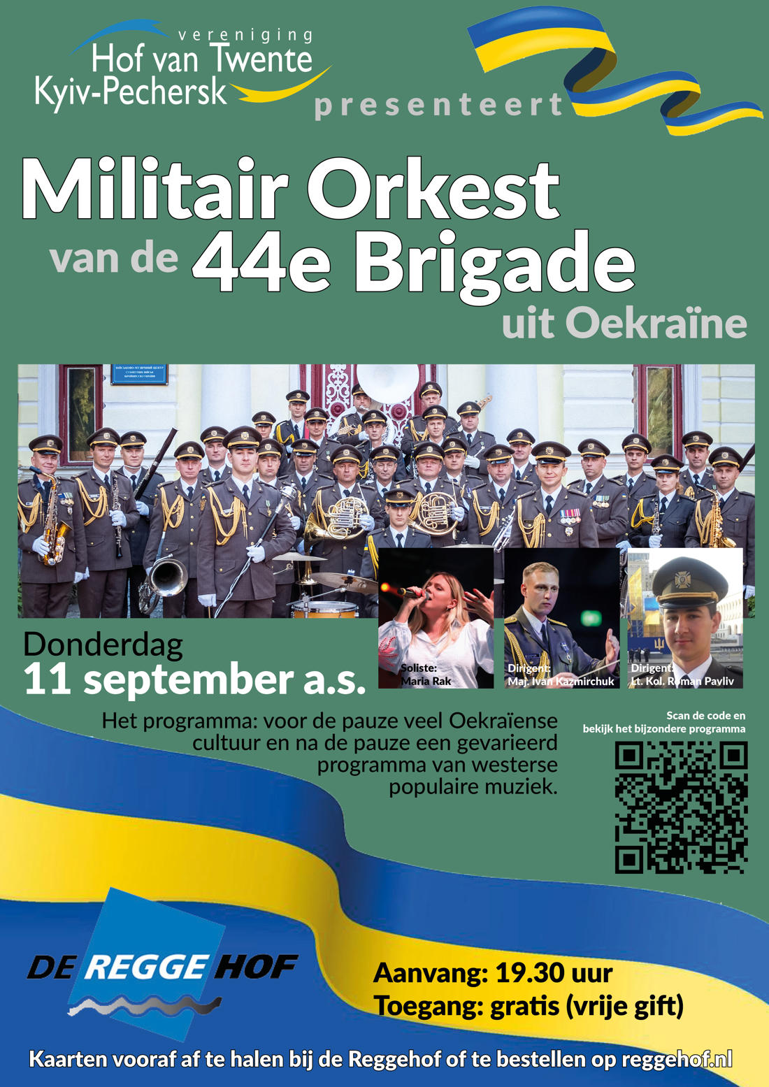 Op donderdag 11 september geeft het Militair Orkest van de 44e Brigade uit Oekraïne een uniek optreden in de Reggehof. Voor de pauze geniet je van Oekraïense cultuur, daarna volgt een gevarieerd programma met westerse populaire muziek.