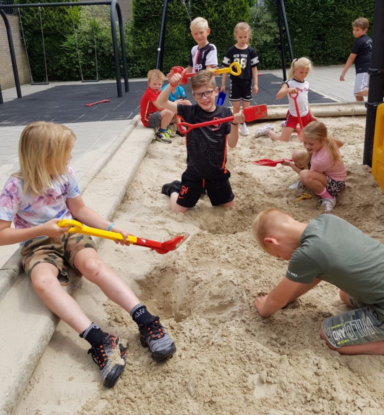 “We overvielen zijn klas tijdens het buiten spelen en vroegen hem een cadeau uit te pakken. Uit zijn keuze kwam een mooie stevige schep tevoorschijn. Wist Stan nog wat hij had gevraagd? Hij moest wel ‘diep graven’. En daar was deze schep dan ook heel handig voor. Maar bij deze ene schep bleef het natuurlijk niet. De complete groep 4 mocht in het fietsenhok zoeken naar meer materiaal. Een voor een kwamen ze terugrennen naar de zandbak met een mooie schep in zijn of haar handen. In allerlei formaten en kleuren.