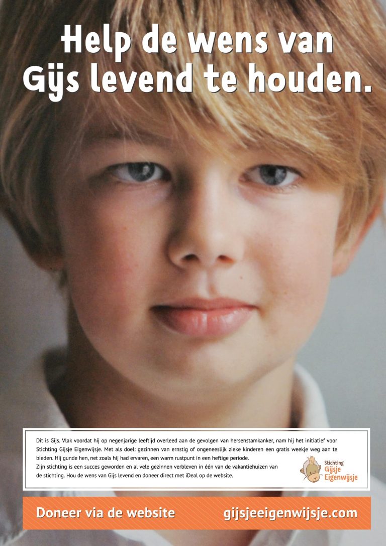 Stichting Gijsje Eigenwijsje is door de 9-jarige Gijs Baeten opgericht in de laatste fase van zijn leven. Met als doel: gezinnen van ernstig of ongeneeslijk zieke kinderen een gratis weekje weg aanbieden. Hij gunde hen, net zoals hij had ervaren, een warm rustpunt in een heftige periode.