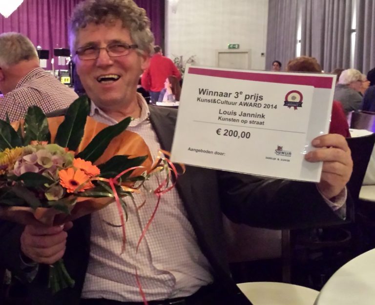 Foto: In 2013 werd Louis als eminente regelneef van het festival Kunsten op Straat Hengelo derde bij de jaarlijkse verkiezingen voor Vrijwilliger van het Jaar afdeling Cultuur.