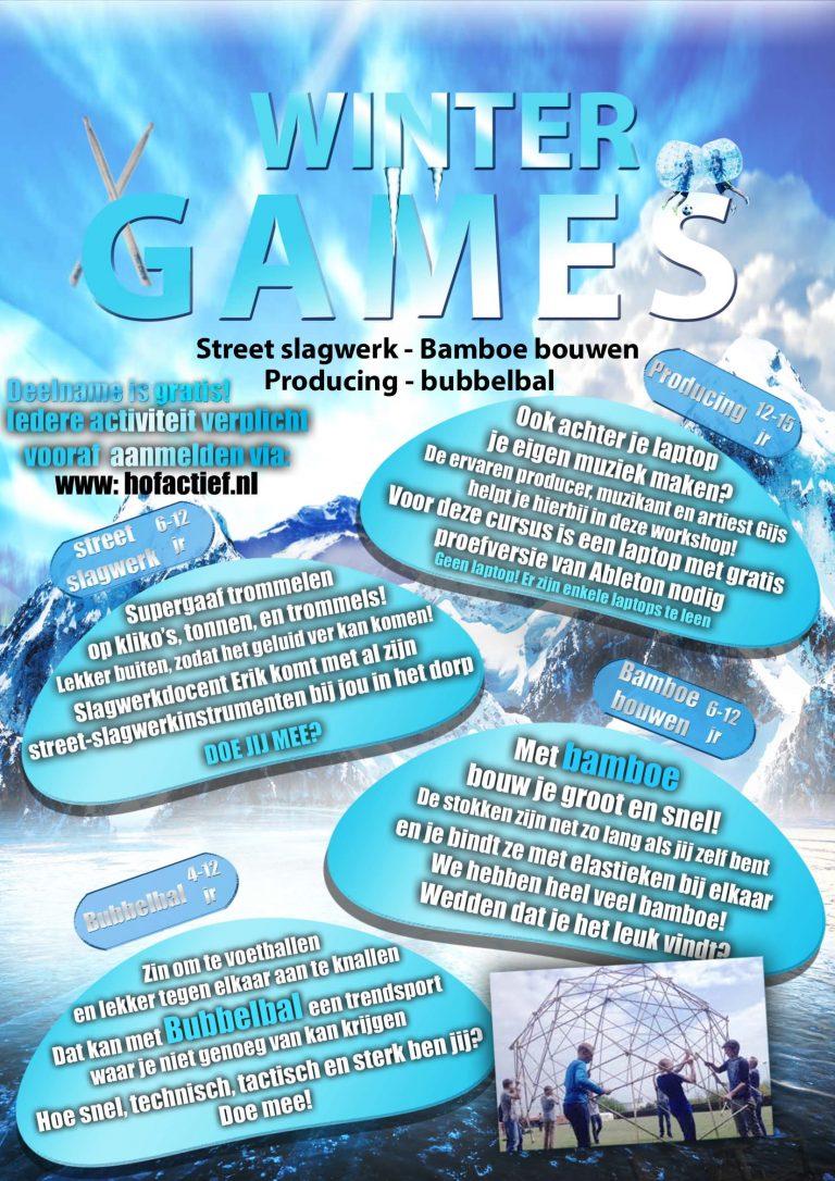 Vanaf de voorjaarsvakantie en daarna nog een aantal weken lang vinden in Hengevelde en Bentelo de Wintergames plaats. Vier activiteiten waar jong en wat ouder zich voor in kan schrijven. Van Bamboebouwen tot Slagwerk en Bubbelbal. De activiteiten zijn allemaal gratis. Wel moet er vooraf ingeschreven zijn via www.hofactief.nl en is er een maximum aantal deelnemers.