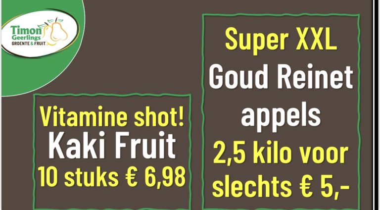 Dit relatief onbekende fruit wordt helemaal hot! Bij onze Timon in de aanbieding: Kaki’s! Een waar vitamine shot! Daarnaast ouderwetse goud reinet appels maat XXL Op naar het kerkplein voor Timon’s groente en fruit carousel!