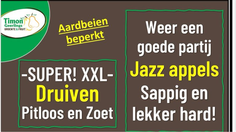 Daar is onze Timon weer met super Druiven maar XXL Pitloos en lekker zoet! Nou, dan (w)eet je ‘t wel! Ook in de aanbieding Jazz appels 🍏 van een goede partij En voor de vroege vogels 🦅 een beperkt aanbod met doosjes aardbei!🍓