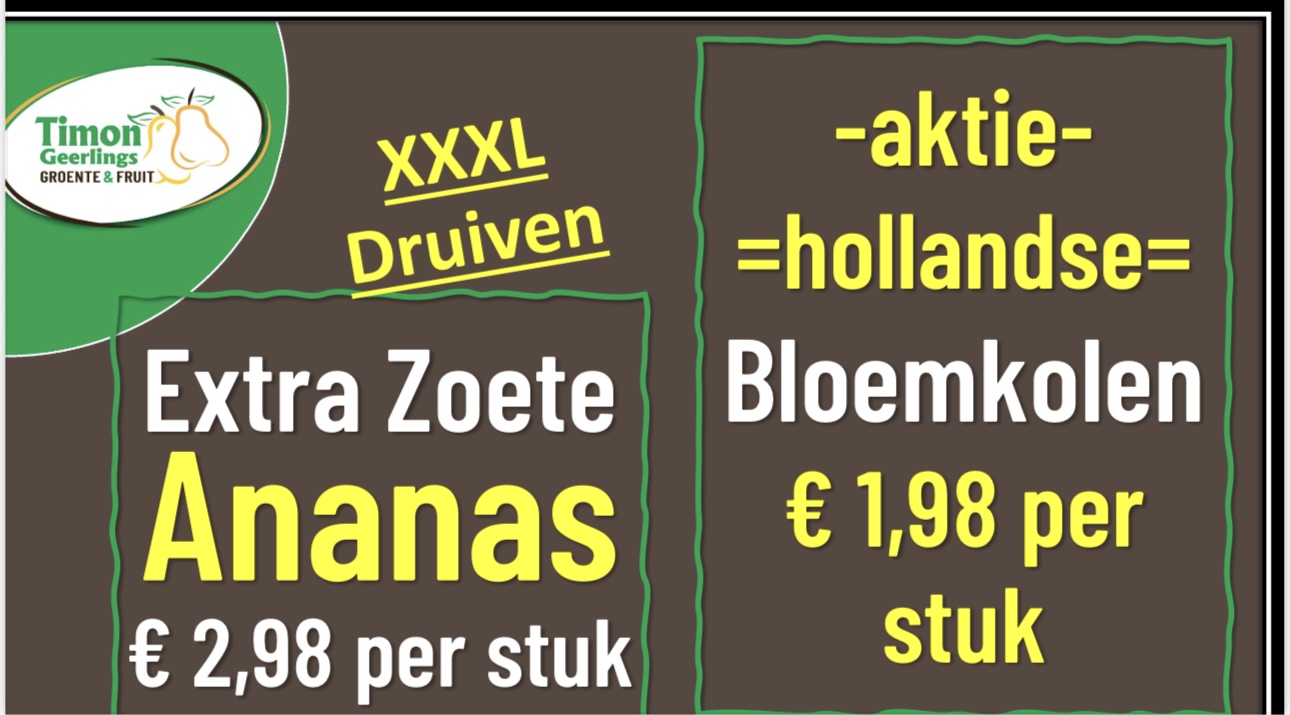 Onze Timon heeft de vrijdag weer van alles in de aanbiedingVan XXXL druiven tot ananas: beide een echt hebbeding!En wat te denken van de actie Hollandse bloemkolen!Die worden u oprecht van harte aanbevolen!