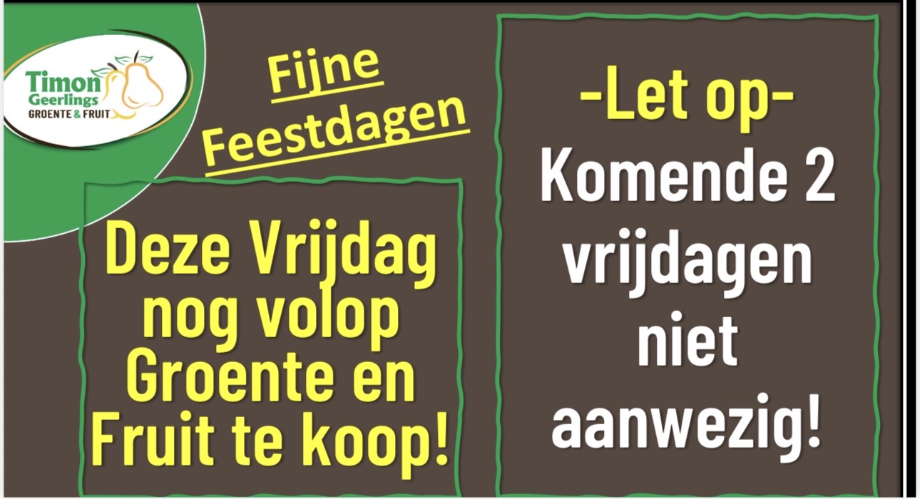 Onze Timon is na de vrijdag twee weken niet aanwezigMaar let op beste mensen; Deze vrijdag is hij nog goed bezig!Volop groenten en fruit te koop voor de laatste keer dit jaarKomt allen naar onze vitamine boulevard!