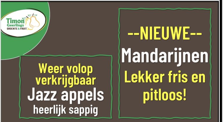 Op naar het Hengeveldse kerkplein, onze Timon is weer daar! Er zijn weer Jazz appels, heerlijk en sappig verkrijgbaar Daarnaast in de aanbieding mandarijnen lekker fris en pitloos Zoveel geluk vind je enkel,heel soms in de casino’s!