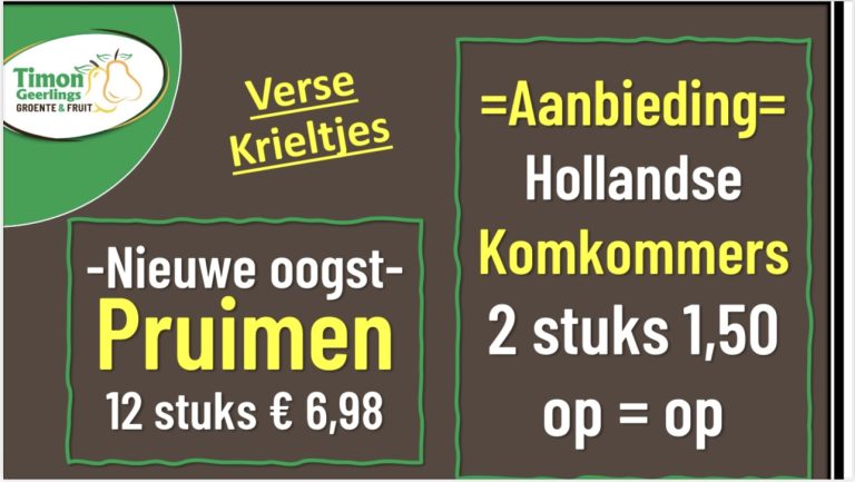 De winter begint het veld te ruimen! Op naar onze Timon: Verse krieltjes en nieuwe oogst pruimen! Daar komen de komkommers bij van Hollandse grond Maak van jezelf of ieder gezinslid vanavond een bofkont!
