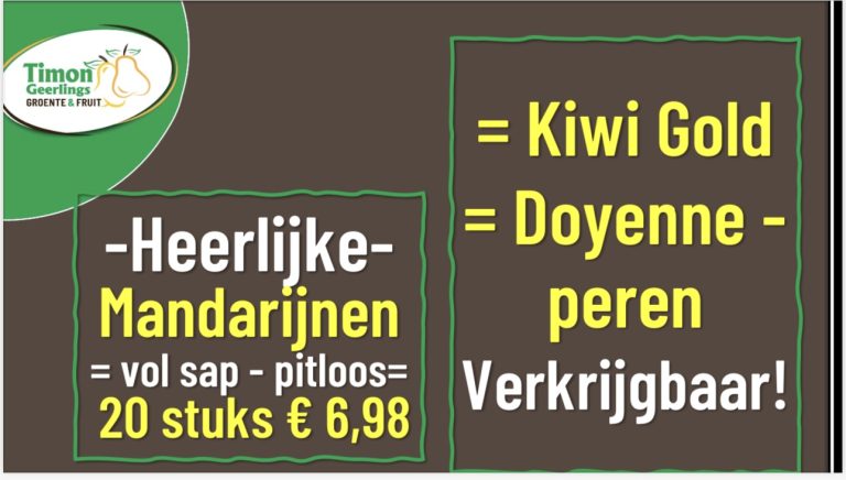 Bij onze Timon kiwi’s Gold en Doyenne peren verkrijgbaar Top fruit van de bovenste plank, hoe krijgt hij het voor elkaar! Daarnaast in de aanbieding heerlijke mandarijnen Niet doorsnee, maar echt hele fijne!!