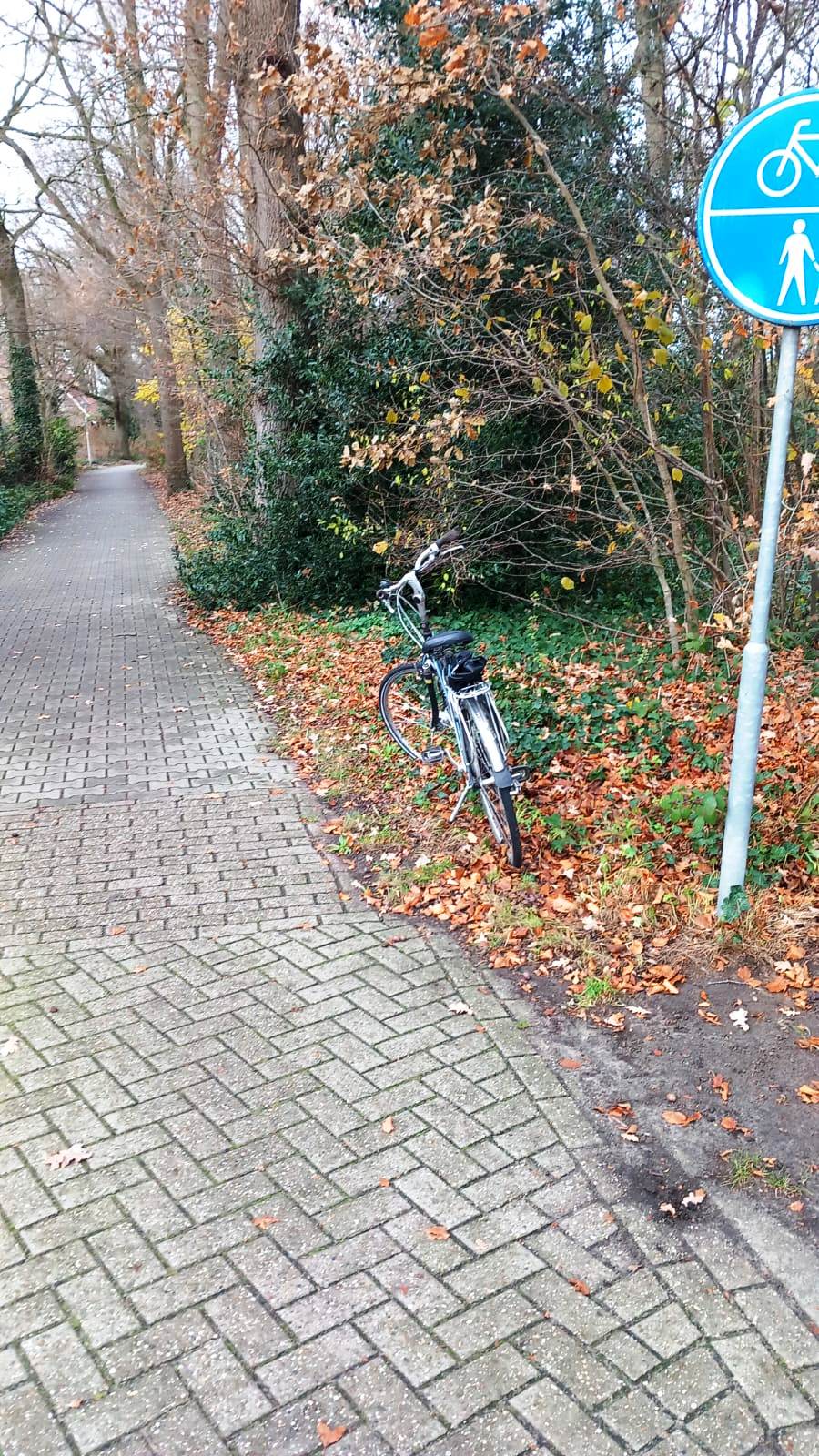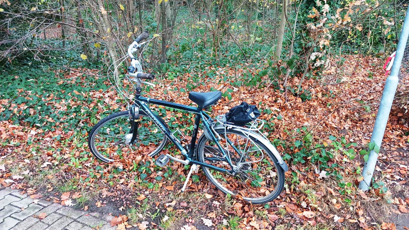 Het gaat om een donkerkleurige herenfiets met bagagedrager en een zadeltas. De fiets staat tegen het groen langs de weg, net voor het bospad. Tot op heden heeft niemand zich gemeld als eigenaar.