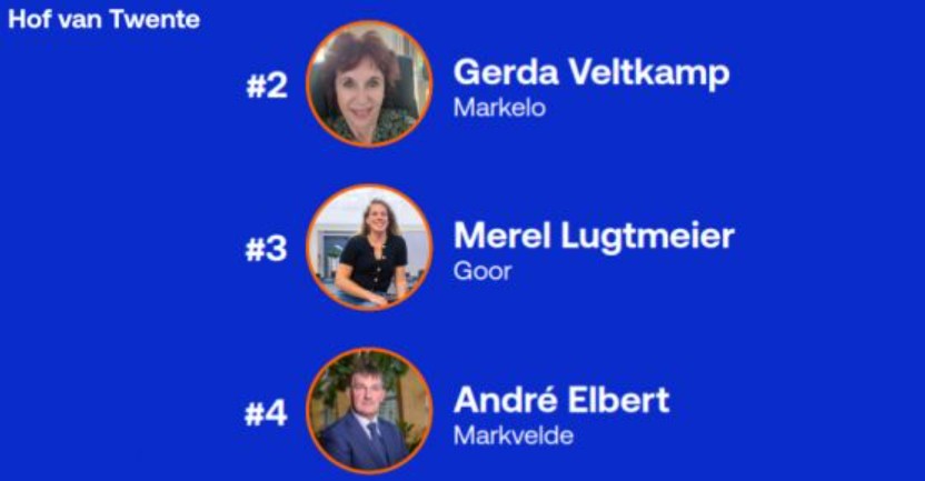 Fractievoorzitter André Elbert (Markvelde) volgt op plek vier; een bekend en ervaren raadslid dat stabiliteit en continuïteit biedt. Nieuwkomer Olga Boutens (Hengevelde) maakt de top vijf compleet. Zij is al lange tijd betrokken bij de partij en wil zich inzetten voor een krachtig en leefbaar Hof van Twente.