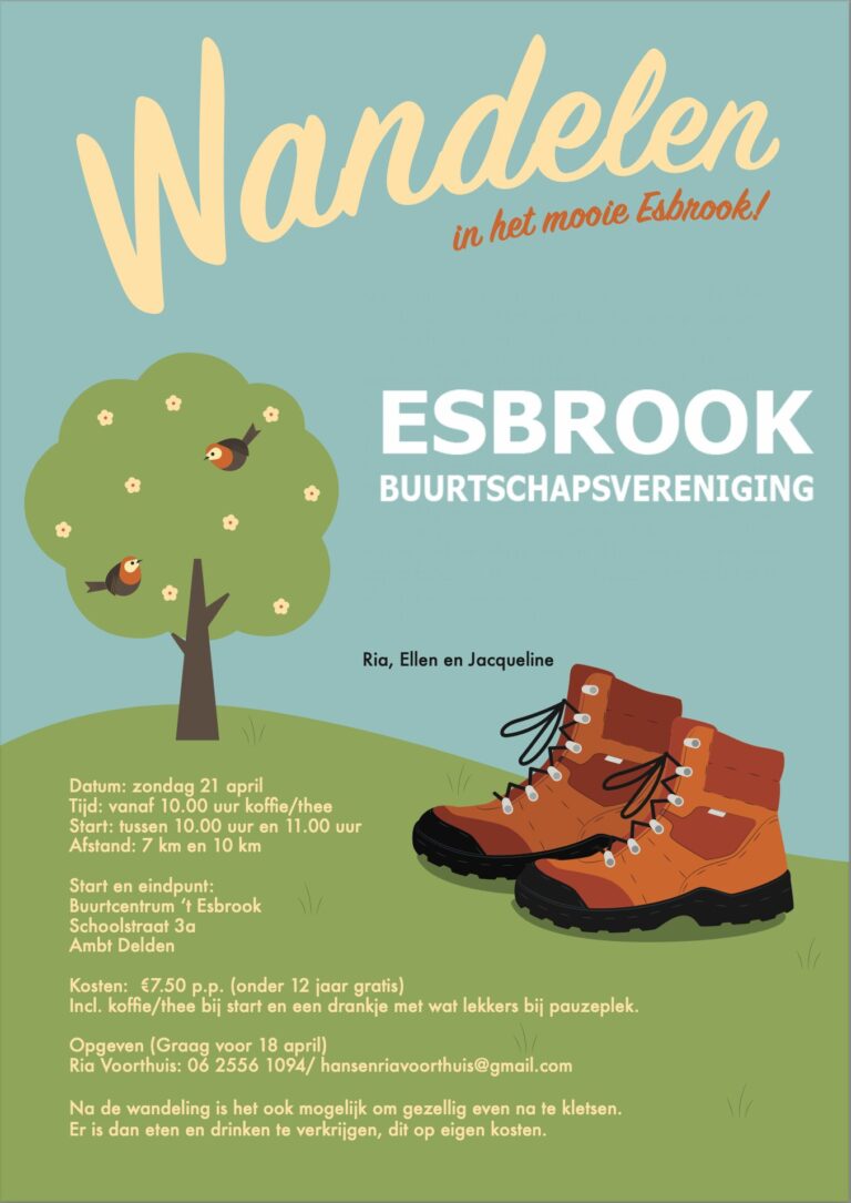 Ja zeker, de voorjaarswandeling staat weer voor de deur! Met wederom twee prachtige routes, een korte en een lange, door de natuur- en plattelandrijke omgeving van het Esbrook. Gezellig af te leggen met een groep op een rustig wandeltempo, of lekker individueel op eigen tempo.