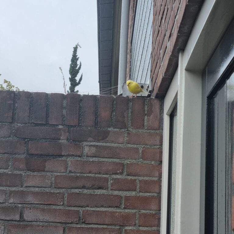 Bovenstaande kanarie is aan komen vliegen in de Ruurstraat. De inzender stuurde de foto op het momen dat het eigenlijk al niet meer nodig was, want een langsvliegende valk was de kanarie te slim af. De eigenaar hoeft dus niet meer te zoeken naar het beestje en is nu verwittigd over het lot.