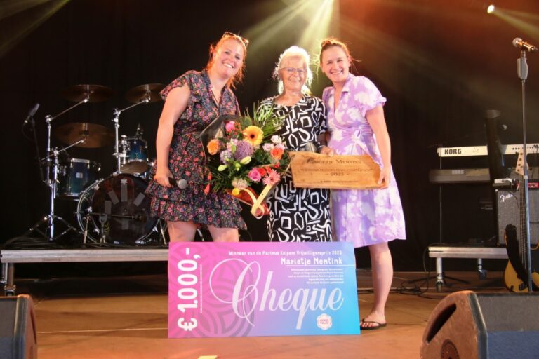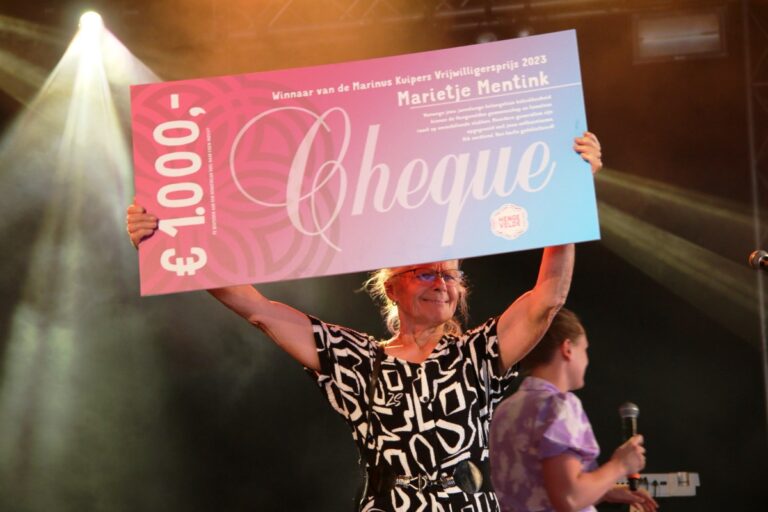 De “Marinus Kuipers Vrijwilligersprijs2023” vol spanning en ongeloof ontvangen door bezige bij Marietje Mentink.