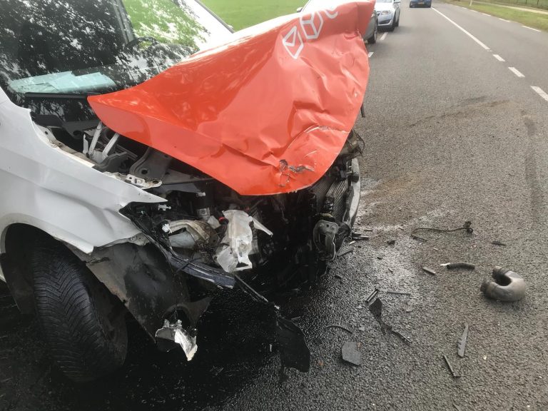 Aan het begin van de middag ging het mis en botste de twee auto's op elkaar. Eén van de auto's is tot stilstand gekomen bovenop een droge sloot. De bestuurster is nagekeken in een ambulance, maar hoeft niet mee naar het ziekenhuis. De andere bestuurder, van de bestelauto van een postbedrijf, is er wonder boven wonder ook van af gekomen met lichte verwondingen.