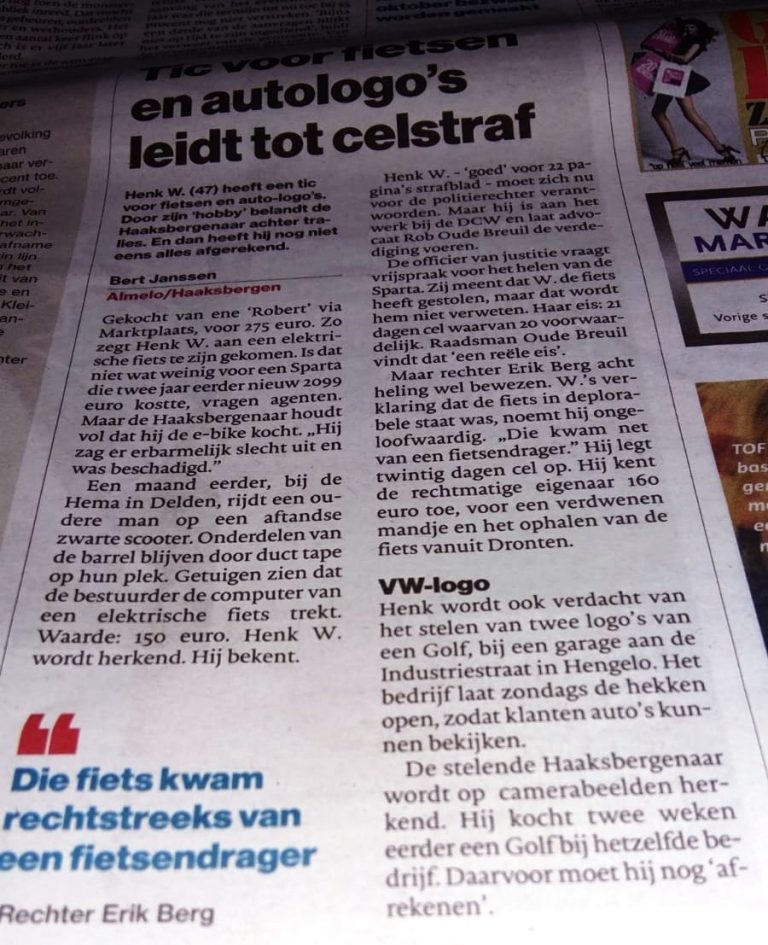 Henk W. (48), die zich ontpopt als ‘plaag’ voor het buitengebied van de Hof van Twente, moet zes weken zitten was te lezen in TC Tubantia. De geboren Ambt-Deldenaar heeft een waslijst aan criminele activiteiten op zijn kerfstok, een strafblad van 25 kantjes, vol diefstallen en heling veelvuldig gepleegd in de Hof van Twente. Henk is dan ook een bekende van de politie zoals in DIT ITEM te lezen was: De politie kwam na een tijdje en arresteerde hem na de diefstal van de fiets van Cees van der Sluijs met de woorden; "Miste je ons al, Henkie?" Ze kenden hem dus al.