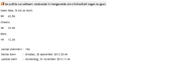 Dat is het resultaat van de enquête die de gehele maand oktober was in te vullen op de voorpagina van Wegdamnieuws. Maarliefst 63,5% van de respondenten gaf aan het niet te weten, maar dat ze de politie nooit ziet in het kerkdorp. 24,4% gaf aan dat de politie onvoldoende surveilleert in Hengevelde, bij elkaar opgeteld bijna 88%. Deze enquête was in het leven geroepen naar aanleiding van de vele schuurinbraken waar de omgeving mee te kampen heeft. Het CDA van Hengevelds raadslid Harrie Scholten wil extra inzet van de politie in nachtelijke uren. Het CDA denkt aan een extra brigade die vooral tussen 1.00 en 5.00 uur moet rondrijden. Rond deze tijden worden de schuurinbraken voornamelijk gepleegd. Overigens kon 12,2% zich vinden in de stelling, zij vinden dat de politie zich wel voldoende laat zien in Hengevelde.