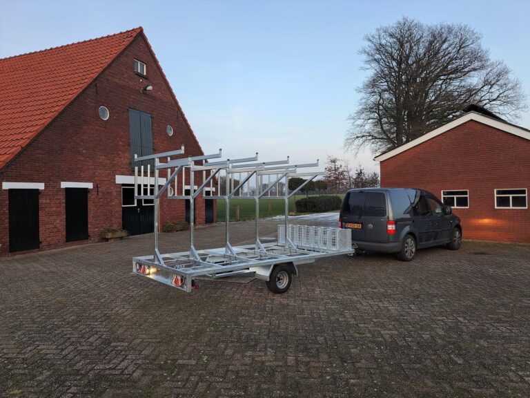 Aanhanger met een meer dan compleet Custers rolsteiger. Koppen van de schoren zijn in de kleuren rood blauw en zwart. Ook zitten er stickers op met onderstaand telefoonnummer.