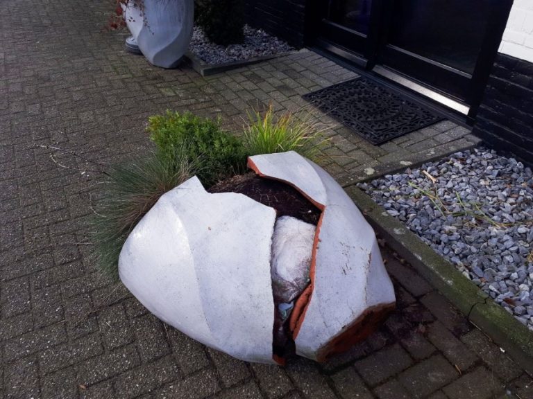 Afgelopen zondag zijn de bovenstaande bloempotten vernield. De daders zijn duidelijk herkenbaar op camerabeelden. De eigenaar wil echter tot woensdag wachten alvorens over te gaan tot aangifte bij de politie inclusief overdracht van de camerabeelden. Het gaat om 1 meisje en twee jongens. De daders kunnen zich melden via onderstaand telefoonnummer: