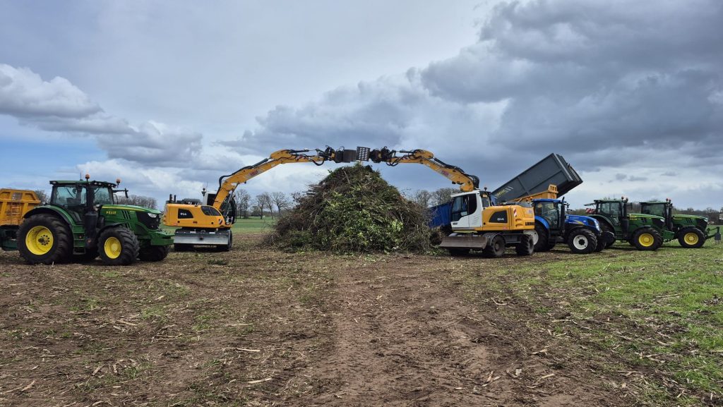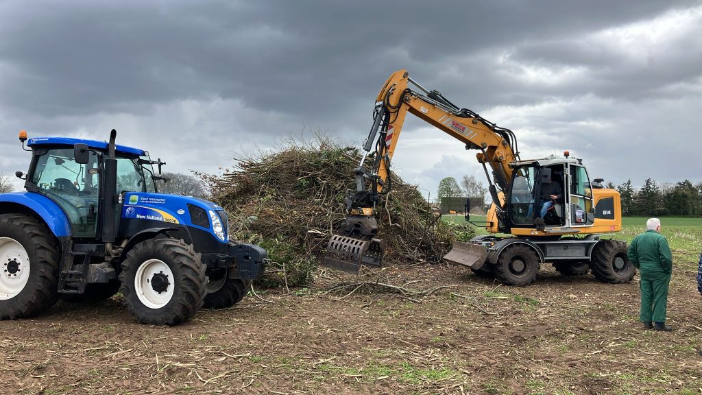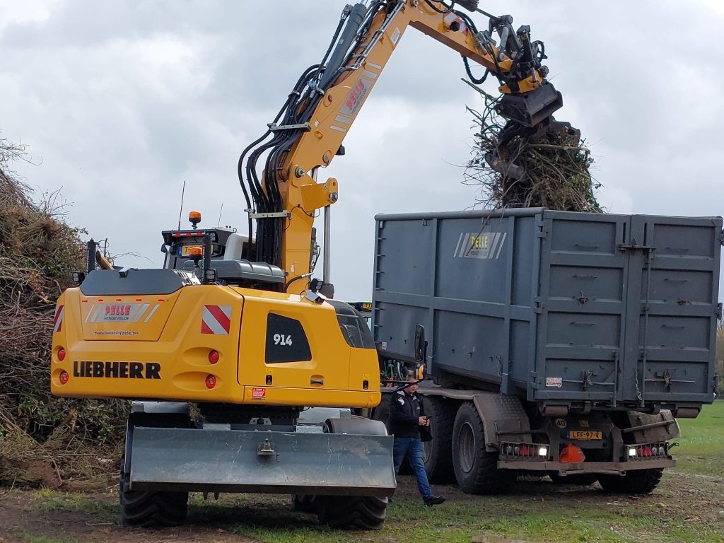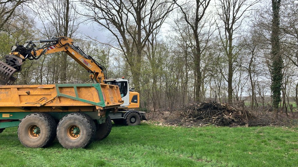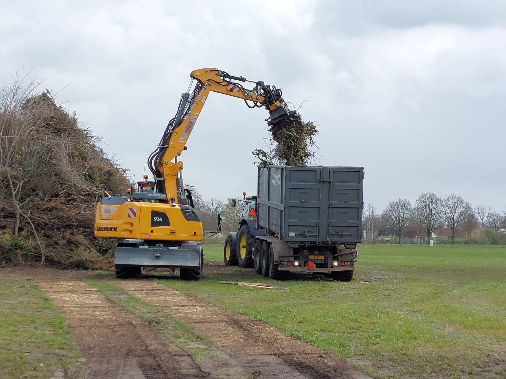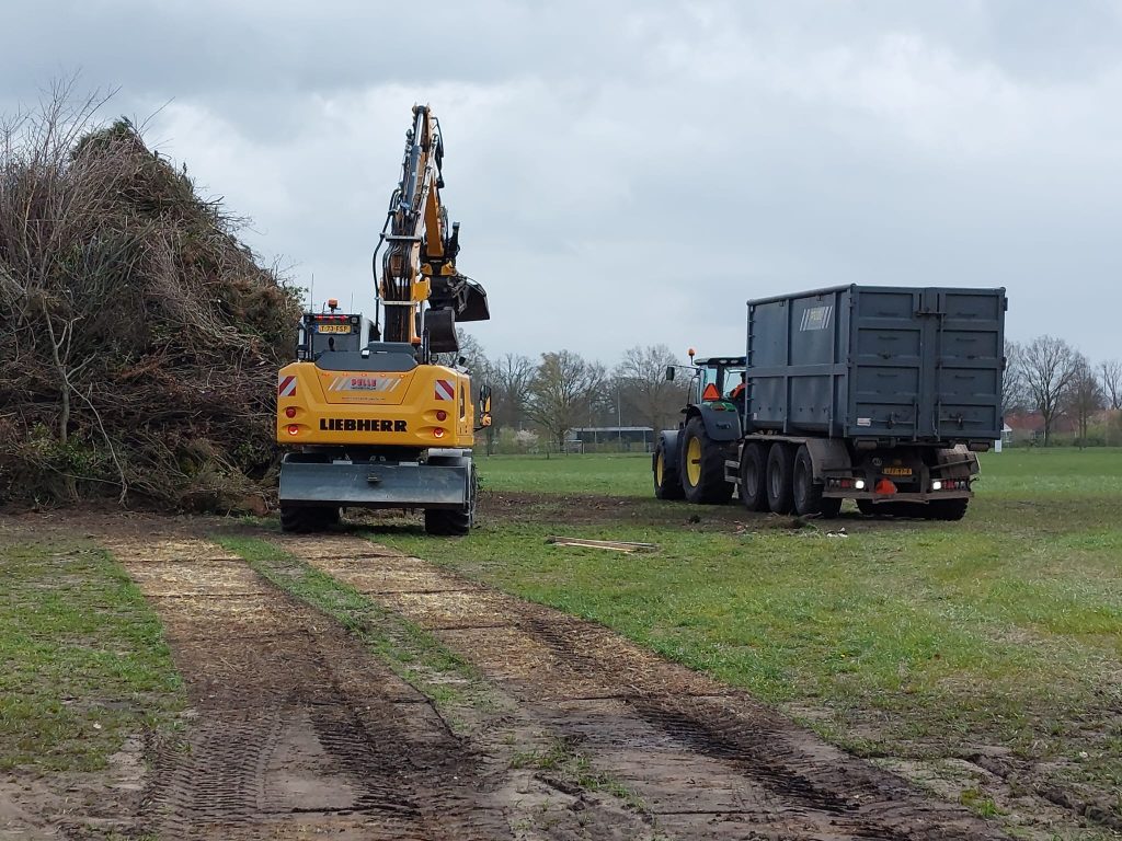 Wouter Assink: “Met drie tractoren en twee kranen van loonbedrijf Pelle, John ten Heggeler aangevuld met een trekker van Geerding en Olminkhof, is de klus geklaard. Er ligt nu meer dan genoeg hout, iedereen ontzettend bedankt!”