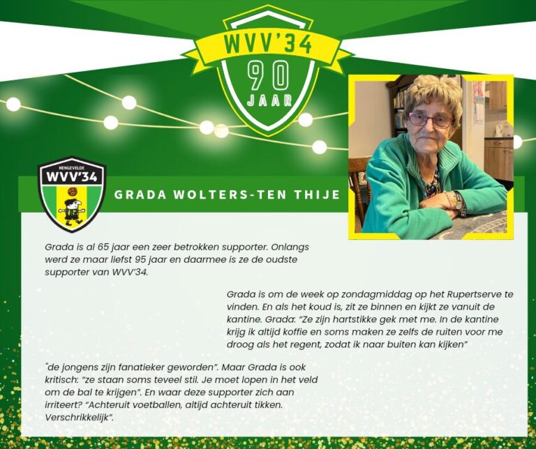 WVV’34 bestaat in september 90 jaar! In aanloop naar ons jubileum interviewen we verschillende mensen die betrokken zijn bij onze club, dit keer Grada Wolters-ten Thije. Grada is al 65 jaar een zeer betrokken supporter. Onlangs werd ze maar liefst 95 jaar en daarmee is ze de oudste supporter van WVV’34.