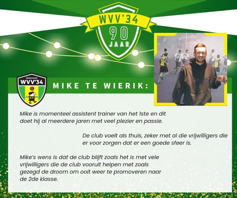 Mike, begonnen als klein jongetje in de jeugd droomt ervan om ooit nog eens met het 1ste te mogen spelen. Een geweldig team bij een geweldige club.De club voelt voor Mike als thuis, zeker met al die vrijwilligers die er voor zorgen dat er een goede sfeer is. Mike’s droom is dat we met WVV ‘34 weer promoveren naar de 2de klasse. Het kampioen worden destijds bij de beslissende wedstrijd was fantastisch om mee te maken en bezorgt Mike nog steeds kippenvel. Een fantastisch moment om aan terug te denken en zeker een droom om weer na te jagen. Andere momenten waar Mike met plezier op terug kijkt zijn de diverse jeugdkampioenschappen welke hij heeft mogen mee maken. En hij is vooral trots als hij ziet als trainer dat jeugdspelers zich blijven ontwikkelen en doorbreken.