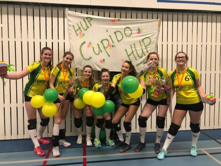 Als je kampioen bent moet je natuurlijk ook de laatste wedstrijd winnen om het feest compleet te maken, en dat deden de meiden. Al ging het niet vanzelf afgelopen zaterdag in sporthal te Bouwmeester in Haaksbergen met Havoc als tegenstander.De wedstrijd ging gelijk op en na de 2-2 moest de vijfde set de beslissing brengen en deze ging met 9-15 winst naar Cupido, het kampioenschap kan gevierd worden! Na het in ontvangst nemen van de medaille van de Nevobo en de bloemen, op naar de kantine van sporthal de Marke. Hier werd de taart gegeten en een drankje gedronken door de meiden, begeleiders, ouders en overige supporters. Daarna gingen de de meiden samen met trainer Martijn en leidster Claudia hun buik vullen bij Eatern Plaza om vervolgens naar Dieka te gaan om het feest compleet te maken. Shirtsponsor EKH bedankt voor de entree en de munten die de meiden mochten ontvangen en taxi ter Doest voor de gratis taxi-rit.