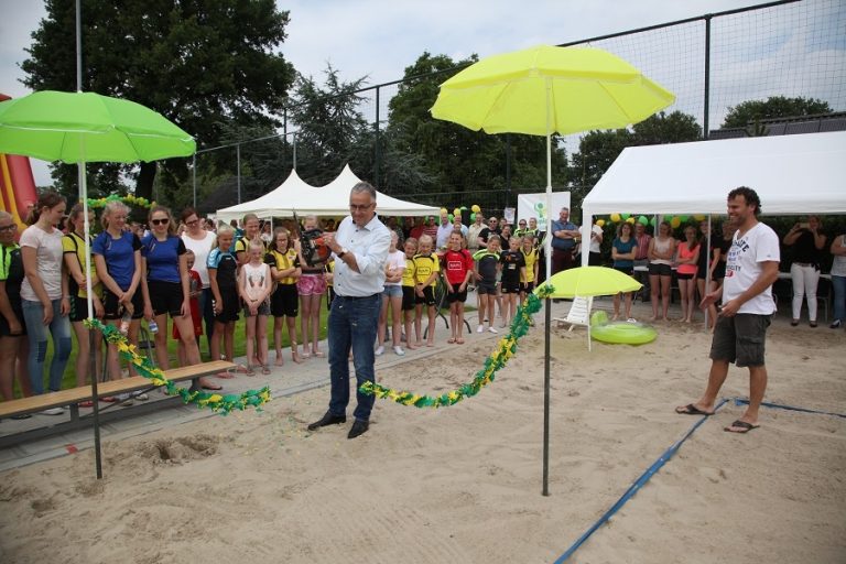De eer was aan wethouder en tegenwoordig eveneens noaber Harry Scholten. Ofschoon de gemeente dit keer niets had bijgedragen aan de realisatie van de fraaie accommodatie wilde men niet aan hem voorbijgaan. Reden voor de wethouder om op te merken dat deze eenmalige “hand op de knip” geen reden is om in de toekomst niet meer bij de gemeente aan te kloppen. Ruim 9 maanden nadat enkele jeugdleden van WHC en Cupido met het idee kwamen zijn de 4 volleybal- en 2 handbalvelden met behulp van vele vrijwilligers tot stand gekomen. Financiële bijdragen kwamen van : De stichting Zomerfeesten, de ouderraad van de Petrusschool, het cartridgefonds, voetbalvereniging WVV’34, Cupido, WHC,`de Rabobank en de uitvoerende bedrijven Geurs en Beuving. Ook zat er nog een bedrag in de scoutingpot van Tuihanti. Een gaatje in de begroting is voorgeschoten door de SSGH en omgezet in een lening voor WHC en Cupido. Onder grote belangstelling werd de 62 bij 25 meter grote zandbak geopend door de wethouder. Met een levenechte motorzaag “knipte”hij een geelgroen lint door. Het Nederlands beachhandbalteam van onder de 18 verzorgde vervolgens een spectaculaire openingswedstrijd. Hieronder het fotoalbum: