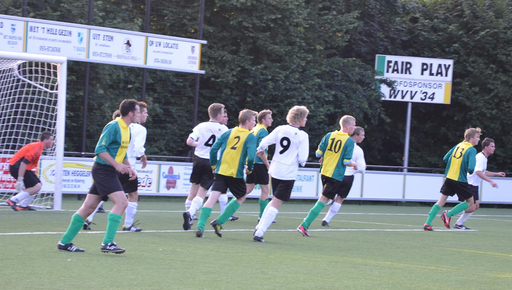 De eerste goal van de kersverse derde klasser uit Laren werd om onduidelijke redenen afgekeurd waarna de Hengeveldse mannen het heft in handen namen. De openingsgoal werd gemaakt door Maurice Workel waarna de Witkampers gelijk wisten te maken. Het was Tom ten Breteler die de ruststand bepaalde en de 2-1 wist te maken. Halverwege de tweede helft was het een dwarrelend schot dat richting de kruising achter keeper Brian Beld belandde waarmee de 2-2 op het scorebord kwam. De laatste 15 minuten moesten de Wegdammers met tien man verder door het uitvallen van Wouter Horstink die zich verstapte en men had reeds drie keer gewisseld. Ondanks de nummerieke meerderheid bij tegenstander Kwam WVV'34 in de slotfase niet in de problemen en was via enkele counters nog dichtbij de winende treffer.