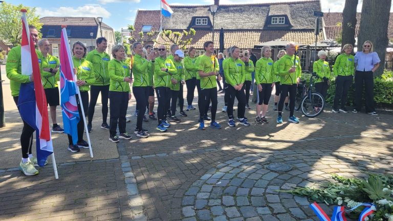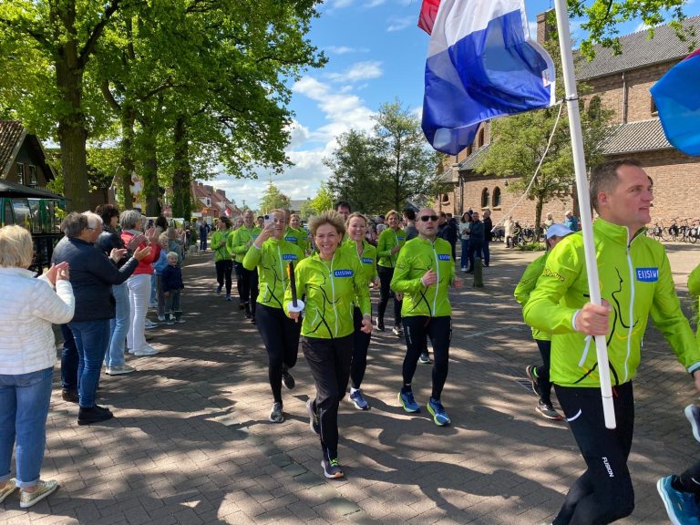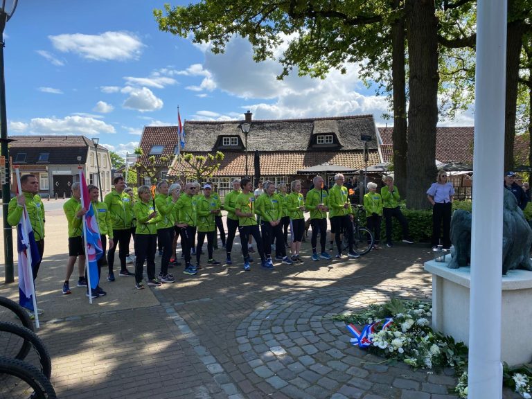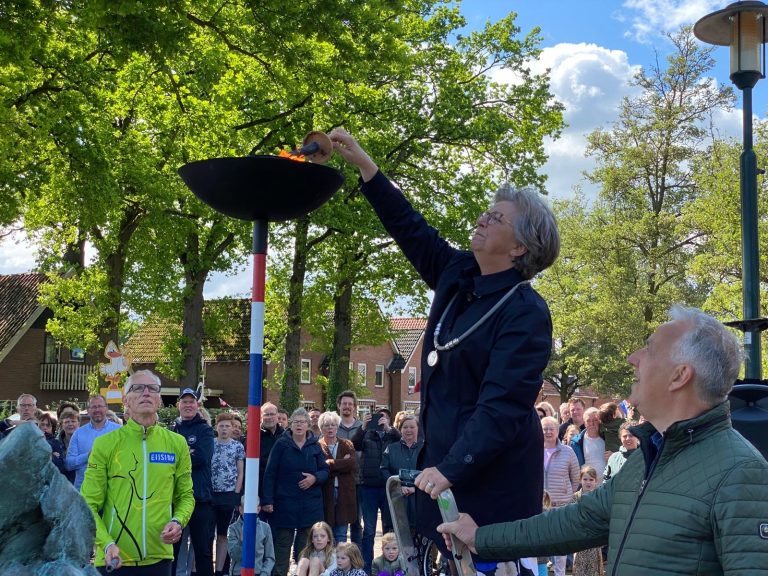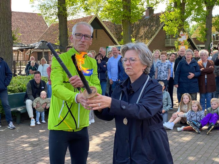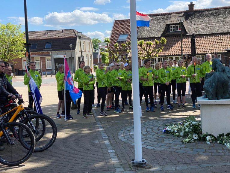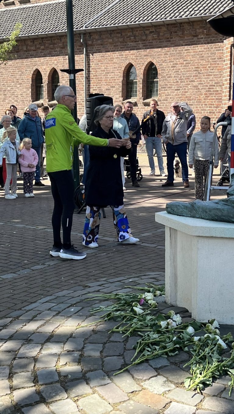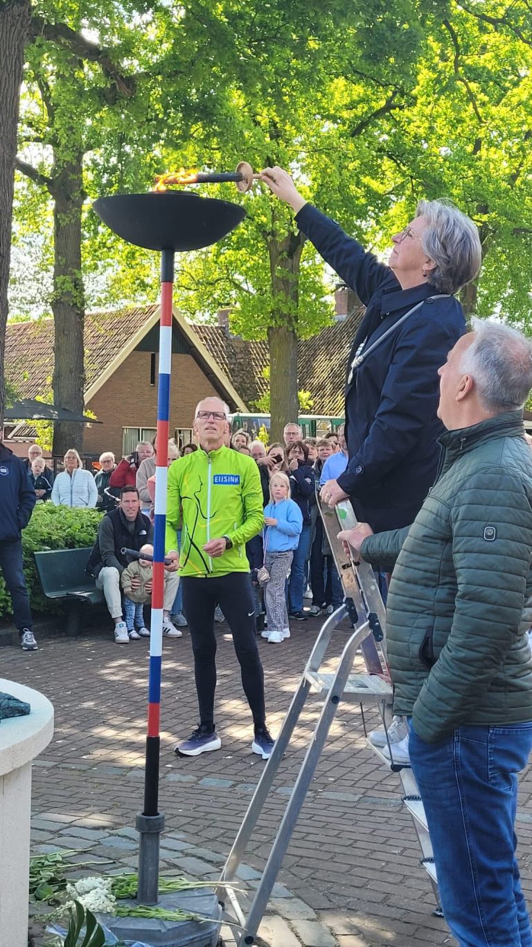 Daar stond een indrukwekkende erehaag te wachten van Hengeveldenaren die de lopers warm onthaalden. Burgemeester Nauta nam het Bevrijdingsvuur in ontvangst en sprak mooie, treffende woorden. Lieke bedankte vanuit de Loopgroep het publiek, met een speciaal woord van dank aan de fietsers: Carla, Peter en Rick ten Buuren en Norbert ten Vregelaar.