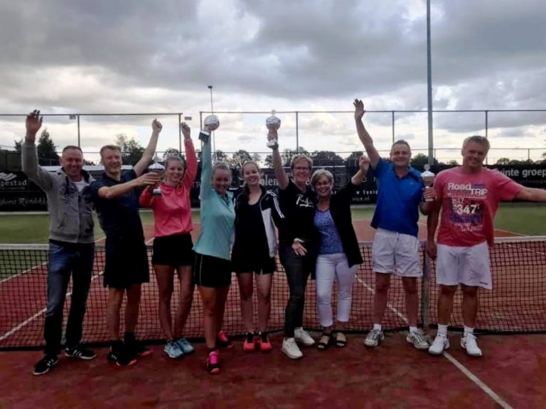Na een spannende driesetter gingen Ronald en Stefan er met de winst vandoor. Het werd: 6-1 / 3-6 / 6-2. In de dames 7 was het net zo spannend en namen Dorien Kormelink en Tess van Rijn het op tegen Maaike Aarnink en Amber ten Brummelhuis. In de poulewedstrijden troffen zij elkaar ook en werd het een driesetter en dat tijdens de finale idem zo, in het voordeel van Dorien en Tess (2-6 / 6-2 / 6-2). Tot slot werd er in de 5/6 gespeeld.