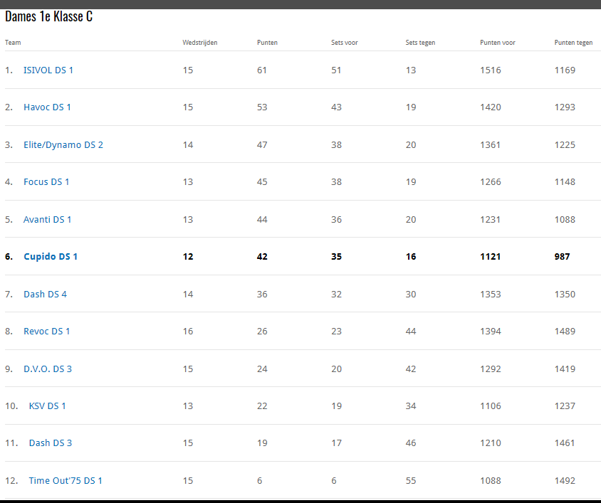 Door dit goede spel doen de dames weer mee in de top 3! Aanstaande woensdag speelt Hengevelde tegen de koploper Isivol in Sint Isidorushoeve om 21:00.Cupido heeft nu 5 punten meer dan in de onderstaande ranglijst
