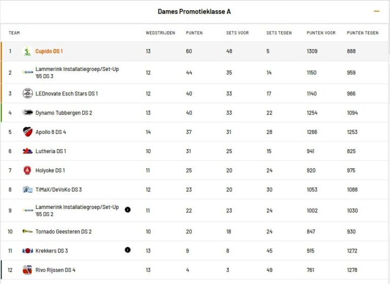 De dames van Cupido hebben vrijdagavond in sporthal de Marke laten zien wat ze kunnen in eigen huis middels een 4-0 overwinning tegen Apollo uit Borne. Ze hebben de 5 punten behouden en staan met dik resultaat bovenaan, zie de stand hieronder.