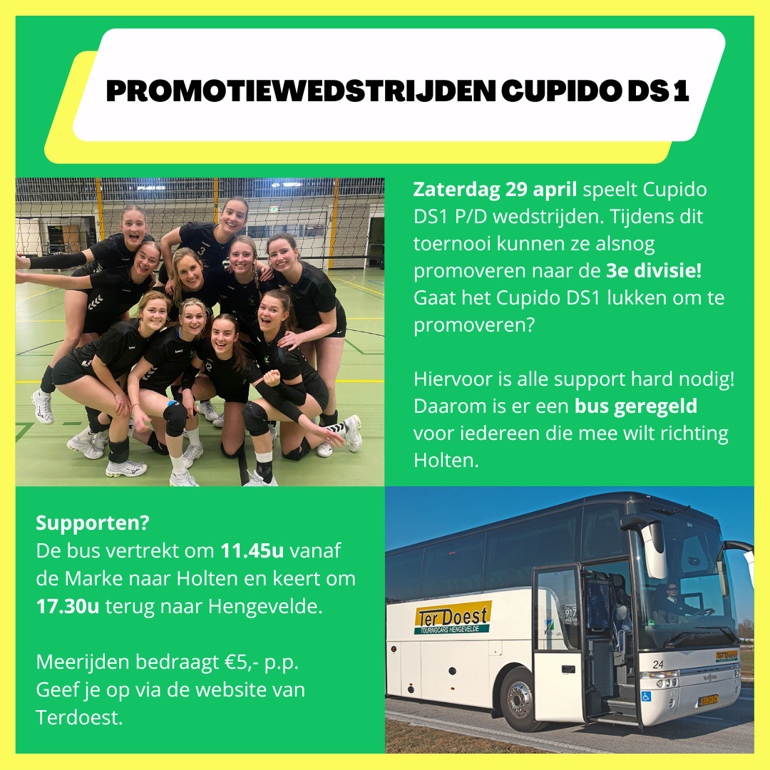Om te mogen promoveren naar de 3e divisie moeten beide wedstrijden gewonnen worden. De dames van Cupido zijn mega gedreven om volgend seizoen mee te draaien in de 3e divisie. In de 50 jaar (Daarover later meer)dat Cupido bestaat heeft het eerste team nog nooit zo hoog gespeeld. Ze zullen er alles aan doen om de winst binnen te halen en te kunnen promoveren! Omdat alle support deze dag hard nodig is, is er een bus geregeld zodat iedereen mee kan naar Holten.