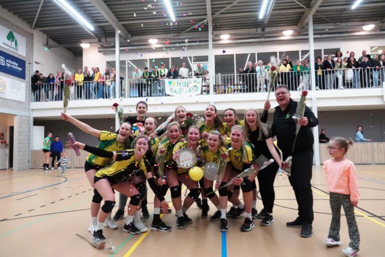 Cupido heeft vanavond in Vasse op glorieuze wijze de titel binnengehaald middels een 4-0 overwinning. De spanning was te snijden in de piepkleine sporthal in Vasse maar Cupido liet van meet af aan weten: Die titel is voor ons! Een bomvolle tribune, trommels, toeters en bellen! Dit kon niet meer mis gaan en dat ging het ook niet! Met 1 gewonnen set was het kampioenschap binnen, de ontlading was groot zowel op het veld als op de tribune. Het veld was bezaaid met confetti dat vanaf een geel groene tribune triomfantelijk naar beneden dwarrelde! Zowel de eerste als de tweede set werd met 25-19 gewonnen.
