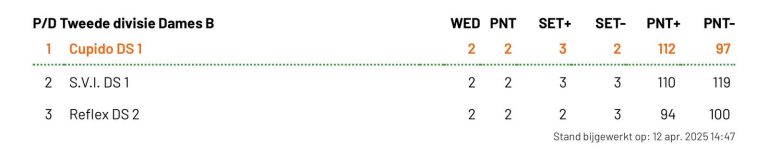 Aan de overkant stond Reflex DS2 , een team met flink wat ervaring. Maar dat bleek voor Cupido geen probleem. De eerste wedstrijd begon sterk. Reflex mocht serveren, maar met enthousiasme, snel spel en slimme keuzes nam Cupido de regie over. Er werd gevochten voor elke bal aan de kant waar geel en groen de toon voerden. Het resultaat: een overtuigende 2-0 winst (1e set: 19-25, 2e set: 18-25). De promotie kwam steeds dichterbij.
