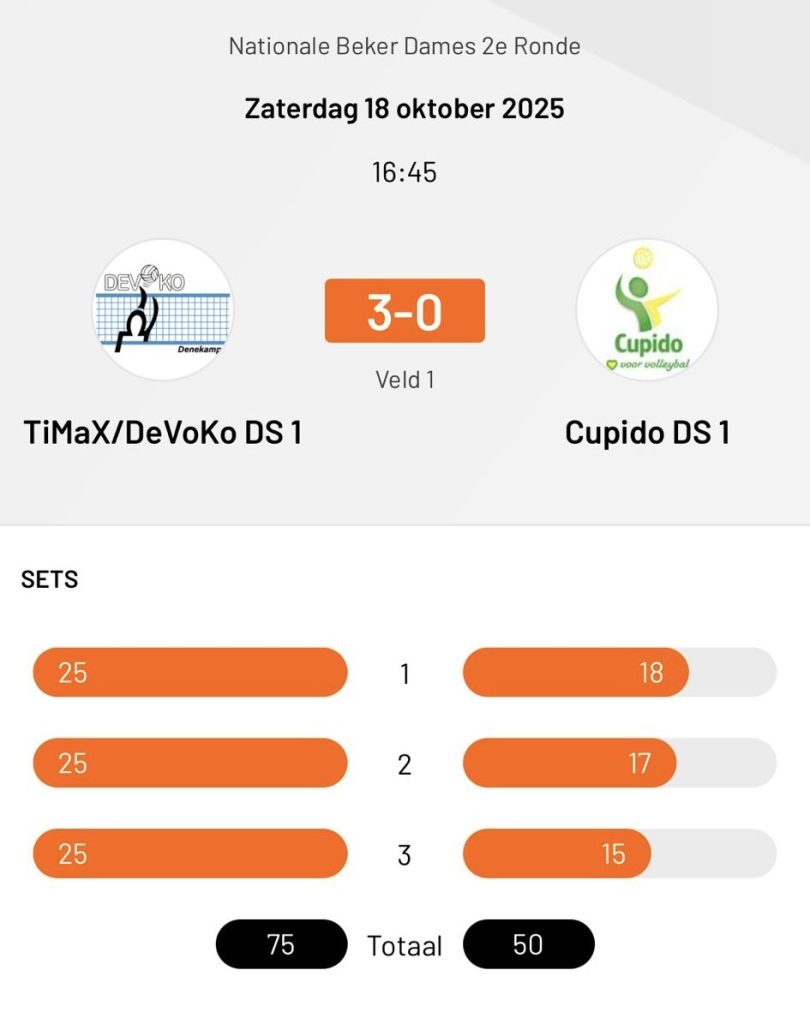 Devoko was op alle fronten net iets sterker: de servicedruk lag hoog, de aanval was gevarieerd en verdedigend stond het aan de overkant goed georganiseerd. Cupido slaagde er daardoor niet in om in het eigen spel te komen. Toch was er veel inzet en strijdlust te zien, en dat resulteerde in een aantal mooie rally’s en spannende momenten.