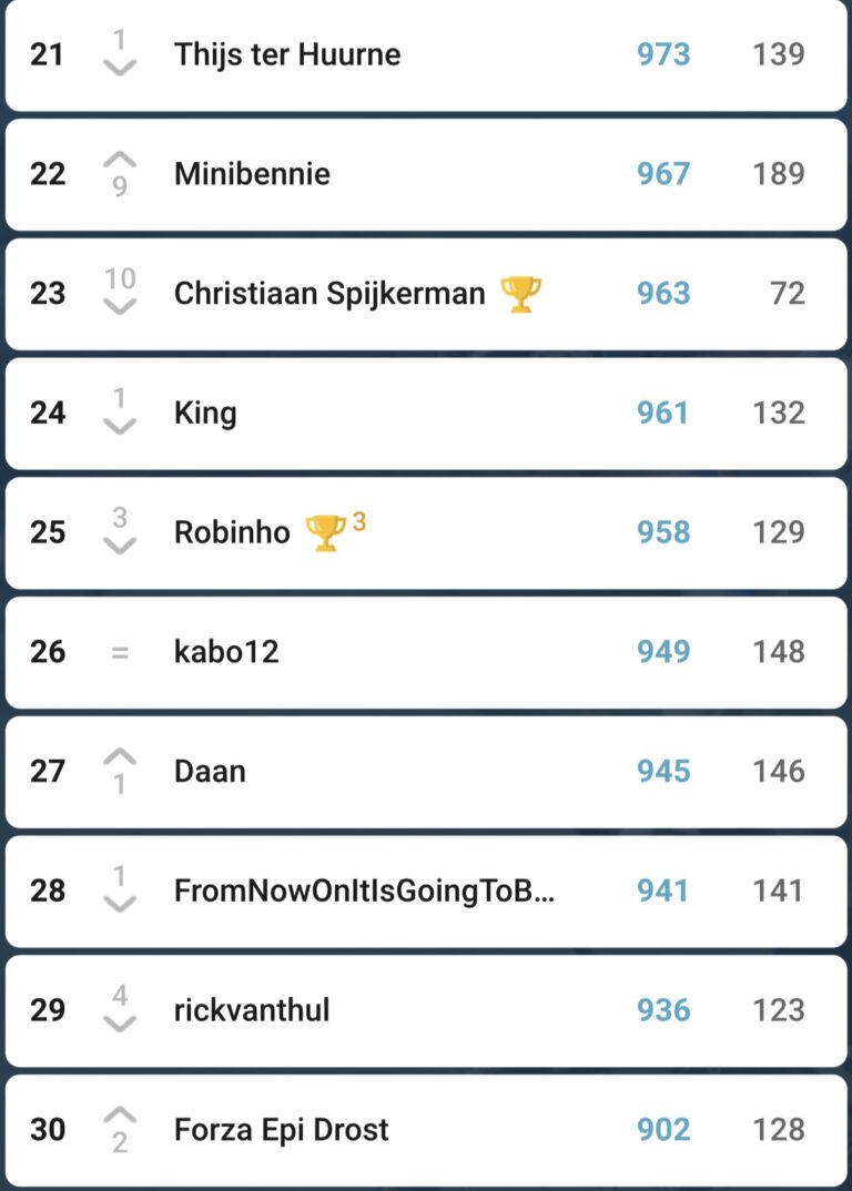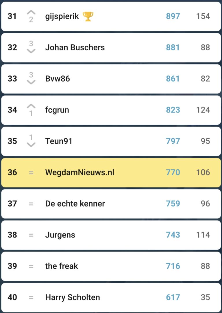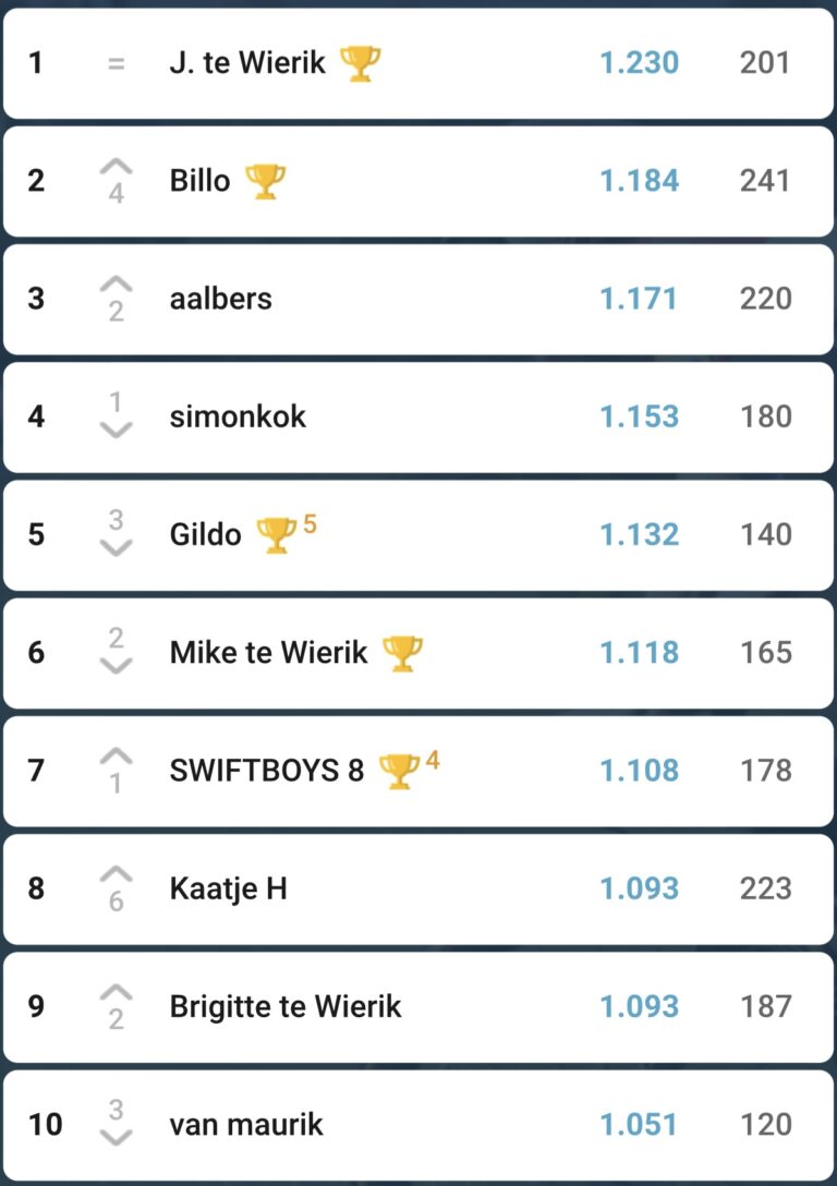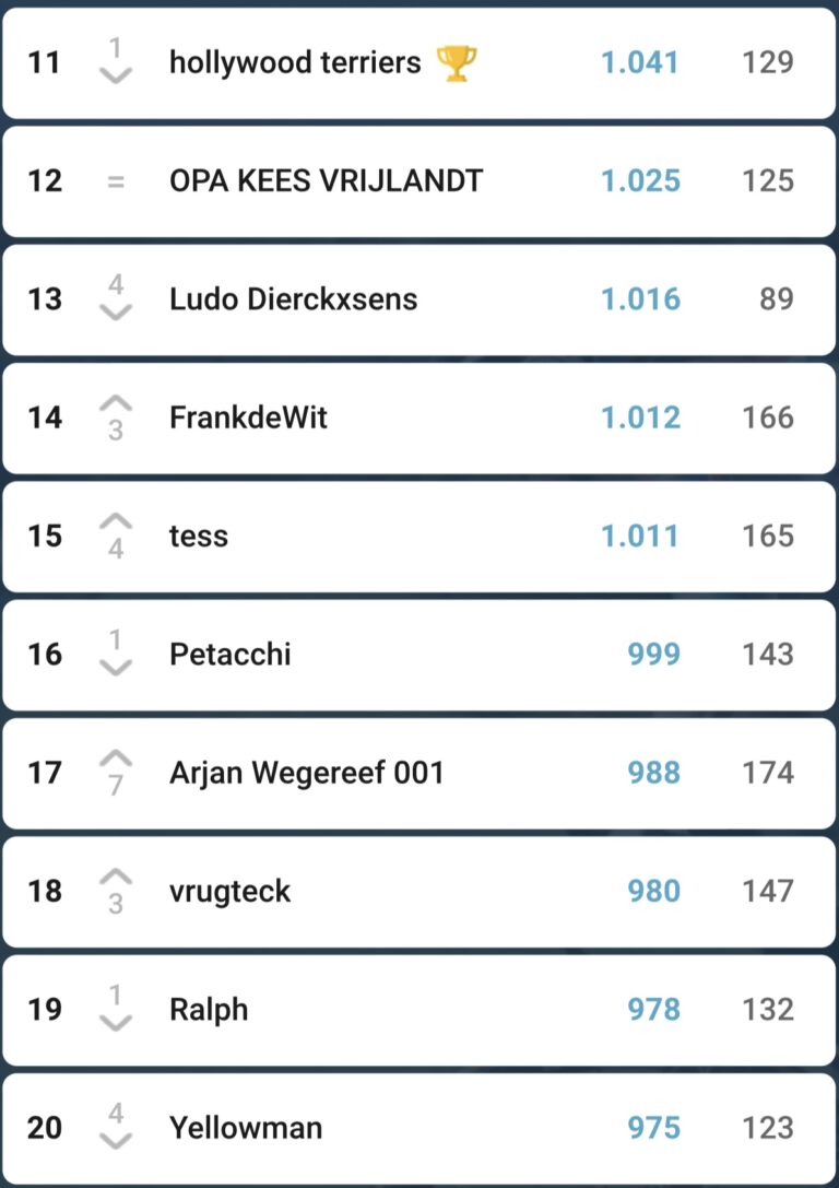 Waar het Europese Kampioenschap Voetbal de meeste aandacht opeist is afgelopen zaterdag de Wegdamnieuws Tourpoule ook weer ‘gewoon’ van start gegaan. En die Jan die kan er wat van! Hij staat zo maar bovenaan man! Maar de weg is nog lang, de marge op de ranglijst kort…. Zou zoon Mike zo maar kunnen denken vanaf zijn 6e stek. Maar moedertje lief praat ook nog mee vanaf plek 9!