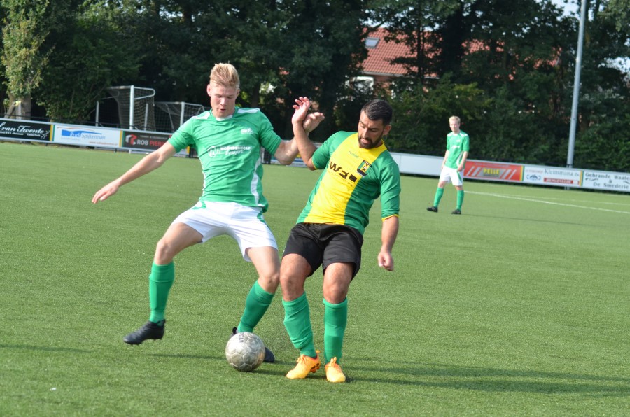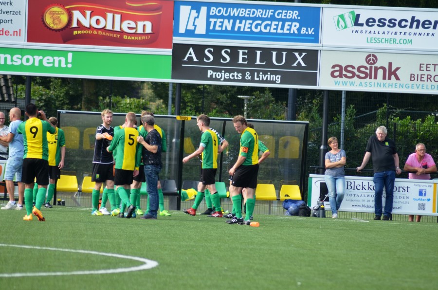 Al na 5 minuten kwamen de groen gelen op achterstand na een foutieve inspeelpass van centrale verdediger Gijs Brummelhuis. Slechts enkele minuten later had Lars Aarnink het antwoord al klaar met een knal vanaf de punt 16 in de verre hoek. In minuut 29 was keeper Tom Pierik iets te gretig en na een fraaie passeerbeweging van de Haaksbergernaar was het 1-2. Wouter Horstink wist deze keer zijn broer Tim wel te verschalken (zie foto boven) na eerst een kans voor open doel gemist te hebben en de ruststand van 2-2 was bereikt.